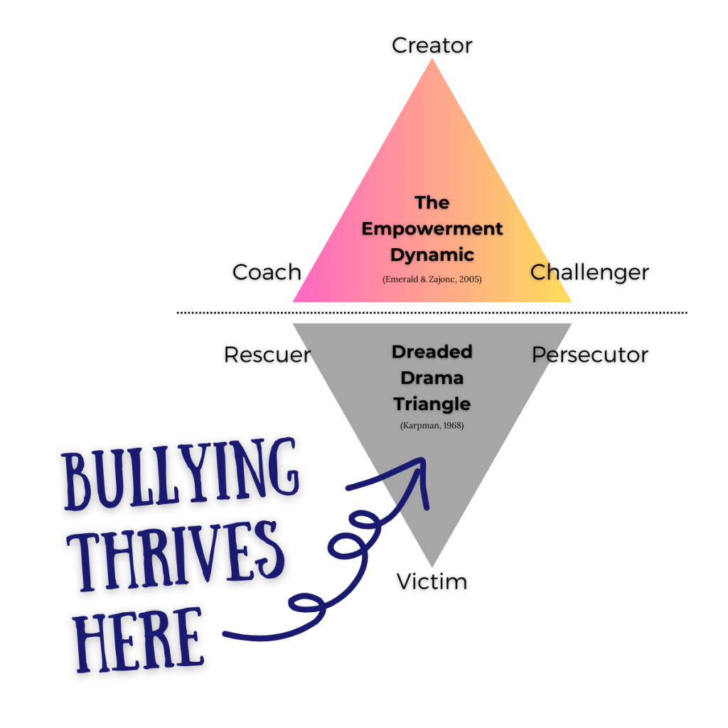 Bullies only exist within the Dreaded Drama Triangle (Karpman, 1968), that colluding, dysfunctional dynamic that joins a rescuer, a victim, and a persecutor into a codependent dance. A therapist colleague of mine told me that 90% of relationships in the United States are considered dysfunctional. She referenced the Drama Triangle to describe the types of issues she frequently works with.