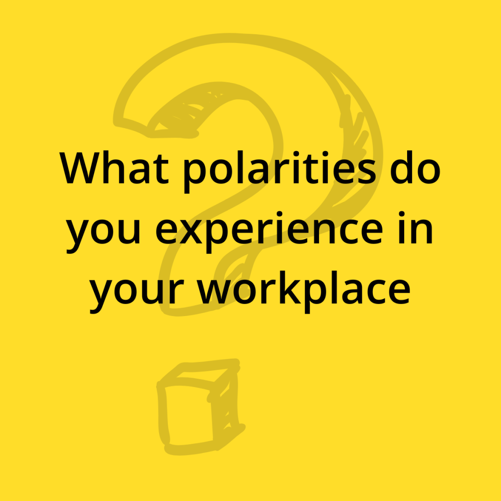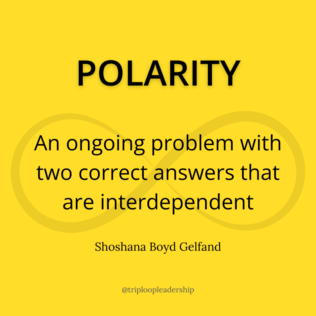 Polarities are interdependent forces, both equally good and right but complete opposites. The “problems” a polarity creates are not meant to be solved or fixed. They’re meant to be managed. There is a natural ebb and flow within a polarity, just like breathing or the seasons. Our job is to understand the positives and the negatives so that we can be intentional to take actions that maximize the one while minmizing the other.